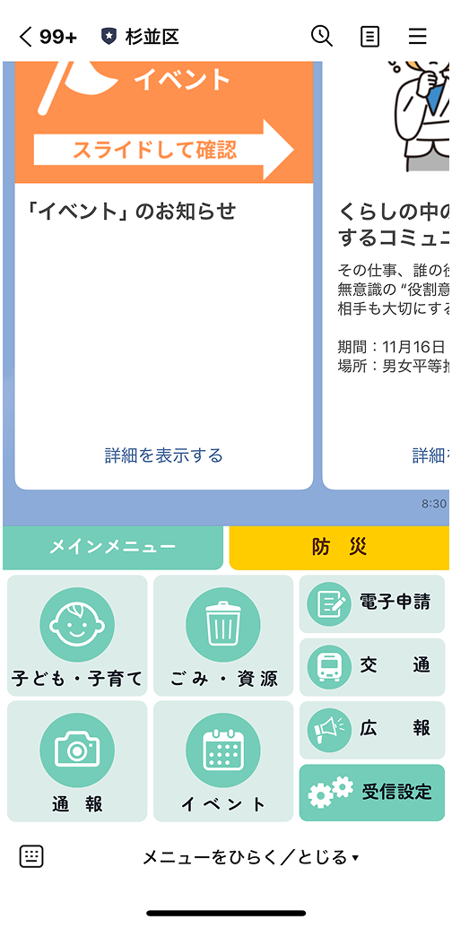 LINE の杉並区公式アカウントを友だち追加いただき、トーク画面下部のメニュー 「交通」ボタンから利用できます。